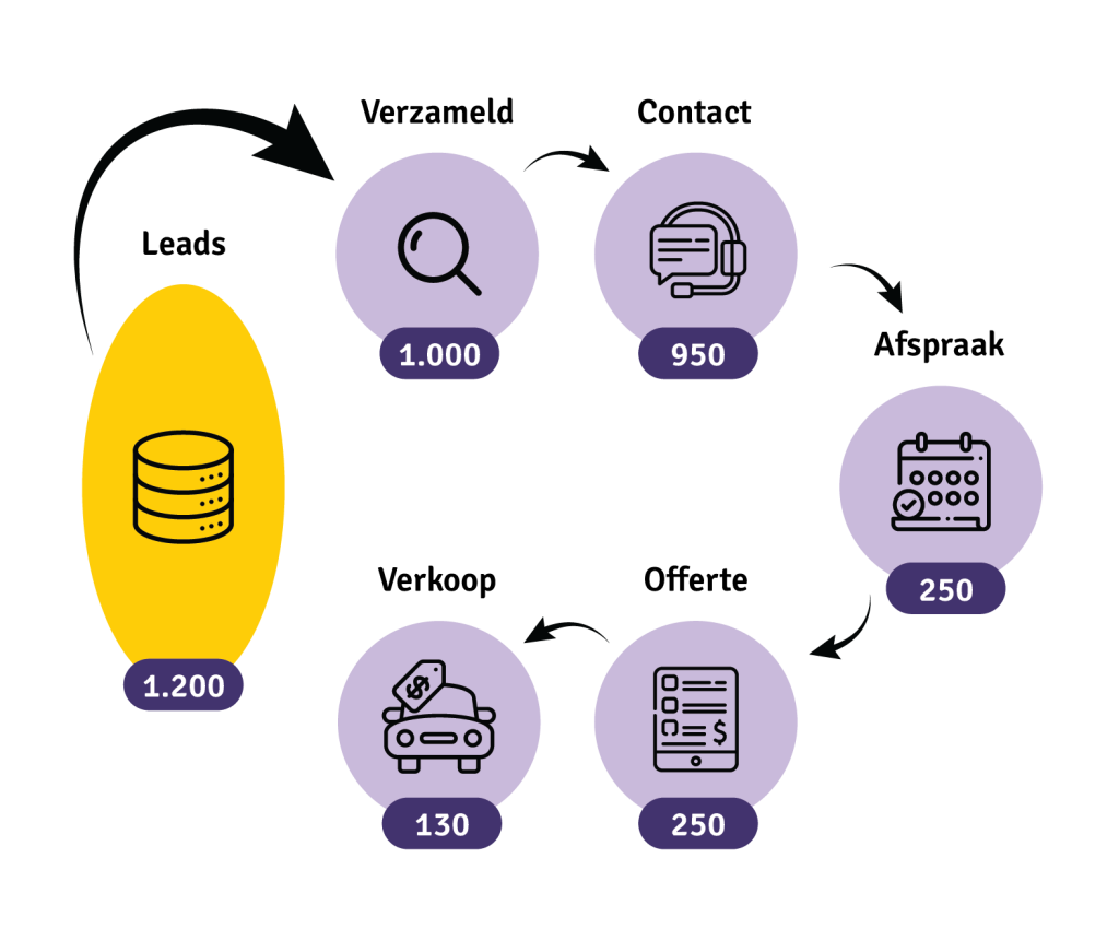 De uitdaging in de verkoopfunnel ligt in de bovenste lagen: hier worden niet genoeg leads opgepakt en omgezet in afspraken. Vaak door drukte en het niet goed prioriteren van de werkzaamheden.